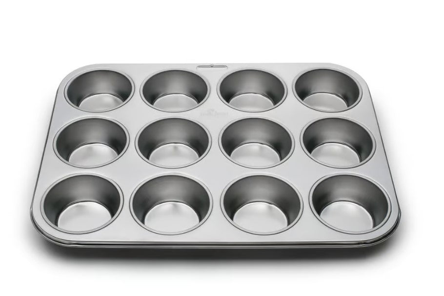 The pan features 12 molds, perfect for muffins or cupcakes, that will evenly brown due to the pan's uniform heat transferring ability.