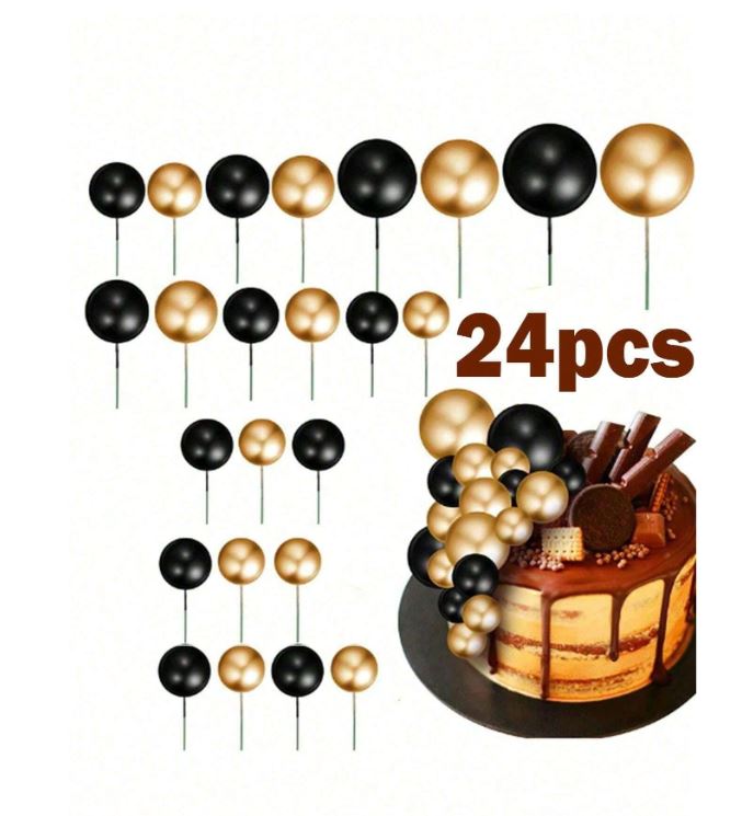 24pcs Black and Gold Foam Balls Cake Topper Set