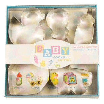 The baby cookie cutter set includes the following 5 cookie cutters: rattle, carriage, duck, block, and baby bottle. The cookie cutters are made from tin-plated steel and are perfect for cutting out cookies, jell-o, brownies, and more. The cookie cutters come in a gift box that is perfect for storing the cutters.