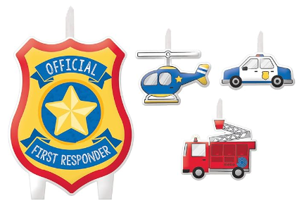 - Featured in the set are a first responders badge, an EMS helicopter, a police vehicle, and a fire truck. Stick each candle into the cake to secure, light the wicks, and let the singing begin.