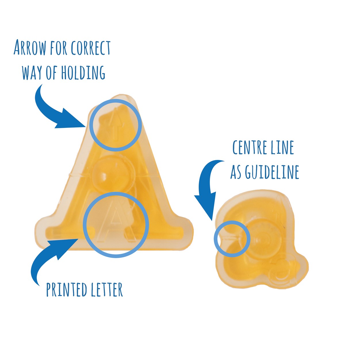 - Reverse side of each stamp shows appropriate letter, difference between upper and lower case, directional arrow and a central line to assist with positioning