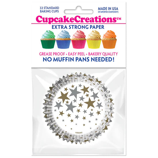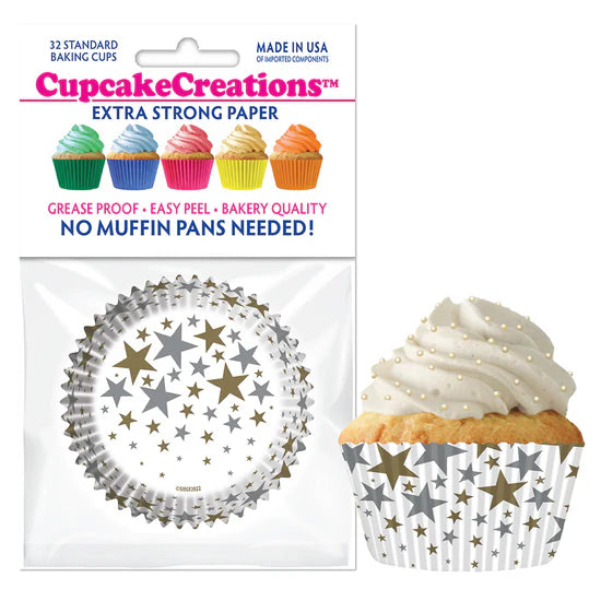 - Cupcake Creations 32 Piece Standard Gold & Silver Stars on White Baking Cups.