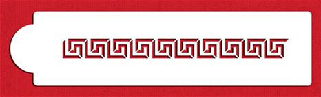 This Greek key cake side stencil measures 1"H x 11.5"W and is cut out of 10 mil, durable food-grade plastic.