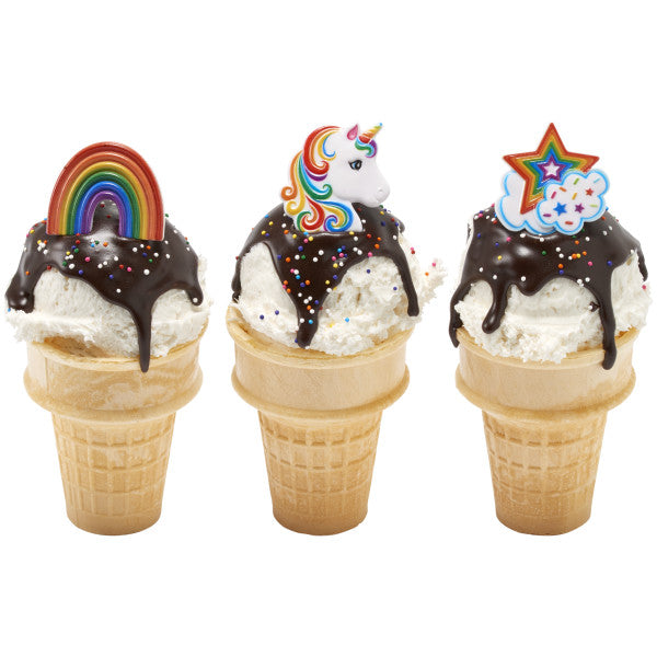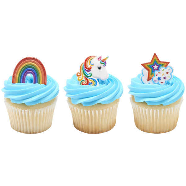 Complete a fantasy look with these rainbow and unicorn themed rings. Great for cupcakes, donuts, or even finish off the look of a cake.