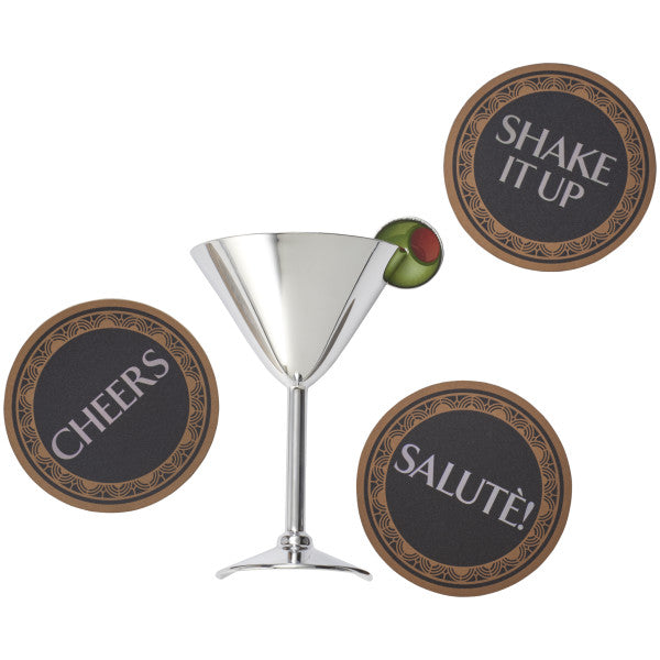 Celebrate in style with martini themed DecoSet! Set includes a small martini glass (made of plastic), and three re-usable poly coasters. 4-Piece set.