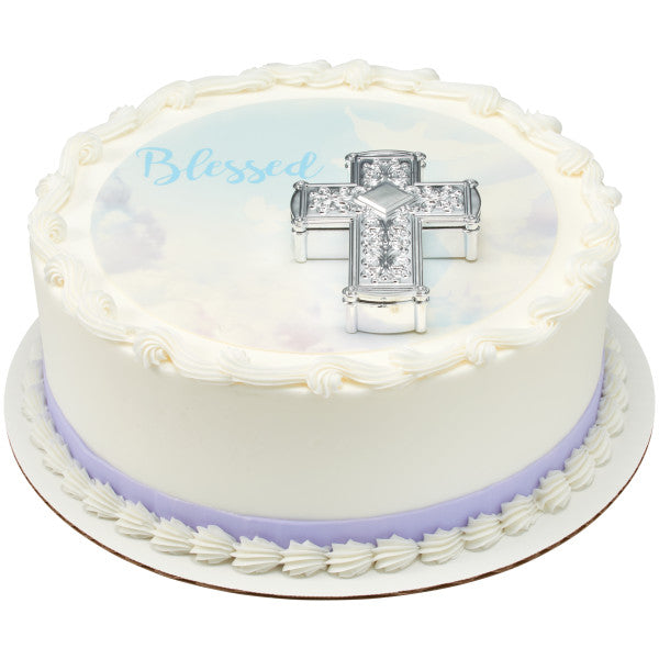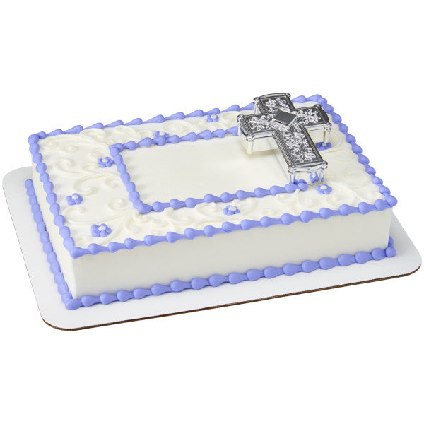 Classic silver cross with scrolling details on the top is also a keepsake box for cherished memories of the occasion. Ideal for use with confirmation, baptism, or other religious cake designs. 1-Piece set.