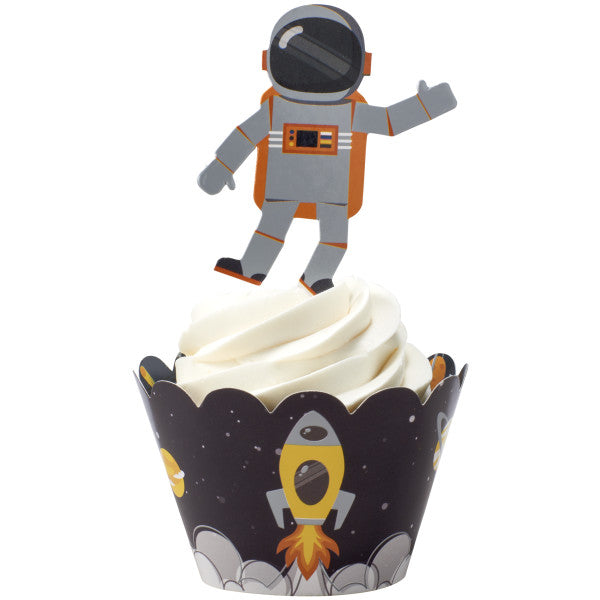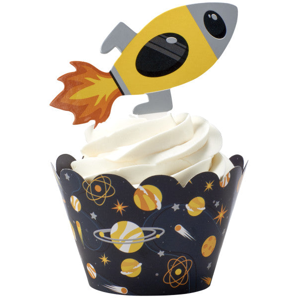 Create an out-of-this-world cupcake assortment with reversible treat wraps! Includes reversible space themed wraps with matching cupcake toppers. Do not bake in treat wraps. Retail packaged.