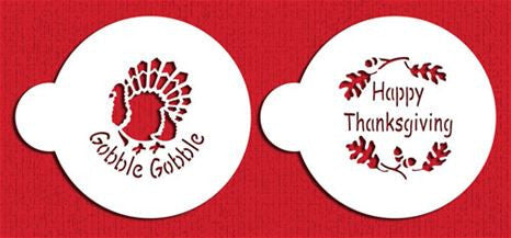 This is a set of two Thanksgiving themed cookie stencil designs. Each design measures approximately 2.5" and fits a 3.5" round cookie. The stencils are made of durable 10 mil food grade plastic for high-quality, professional, repeat use.